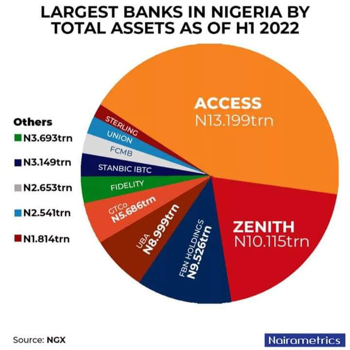 The top ten (10) banks as of H1 2022 are; (1) Access Bank with assets of# 13.199trillion. (2) Zenith with assets of #10.115trillion. (3) FBN holding with assets of #9.526trillion. (4) UBA with assets of #8.999trillion. (5) GTco with assets of #5.689trillion. (6) Fidelity with assets of 3.693trillion. (7) Stanbic IBTC with assets of #3.149trillion. (8) FCMB with assets of #2.653trillion. (9) Union with assets of #2.541trillion. (10) Sterling with assets of #1.814trillion.