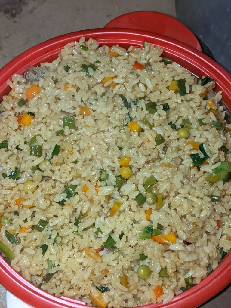Recipe-Dambun shinkafa. Ingridients- rice granules(tsakin shinkafa), red & green pepper, scotch bonnet, onions, vegetable oil, spinach/moringa leaves, spring onion, groundnut, salt, seasoning. Procedure: Wash rice granules, strain & put into calabash for 30mins, mix rice granules wit salt & steam half done & allow to cool. Remove groundnut shaft & roughly grind, wash spinach/moringa leaves, spring onion & cut, wash scotch bonnet & greate. In a large bowl add rice granules, groundnut, spinach, spring onion, scotch bonnet, seasoning, mix well & steam. Wash red & green pepper, onions cut & steam seperate. Fry vegetable oil wit onions. When steamed, in a bowl add “dambun shinkafa” steamed pepper & onion wit fried vegetable oil & mix and sreve. Ur dambun shinkafa is ready.